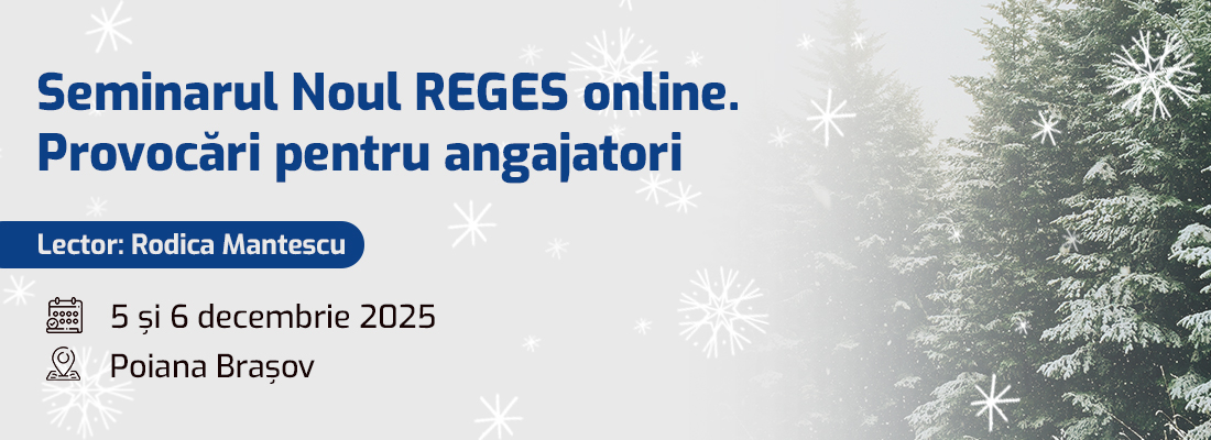 Rezervati-va chiar acum locul dvs. la Seminarul Noul REGES online. Provocari pentru angajatori care va avea loc in perioada 5 - 6 decembrie 2025, la Poiana Brasov. In cadrul acestui seminar, lectorul Rodica Mantescu, reputat specialist in relatii de munca, va explica in detaliu implicatiile practice ale tranzitiei la REGES online, cu accent pe procedura de urmat in diferite situatii concrete.